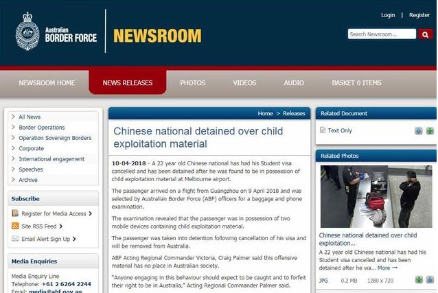 无独有偶,就在今年4月9日,一名由广州飞往墨尔本的留学生,又因为携带儿童色情影像被驱逐出境了。