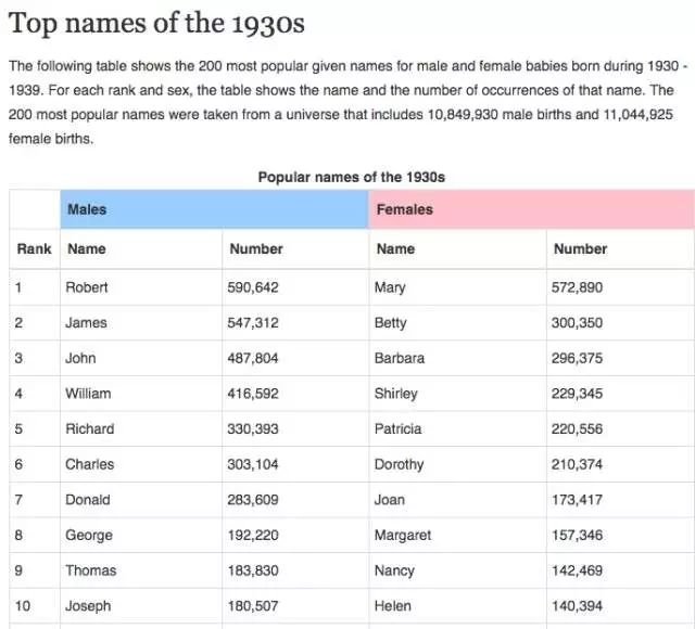 (图:史密森学会统计30年代年代最流行的英文名)