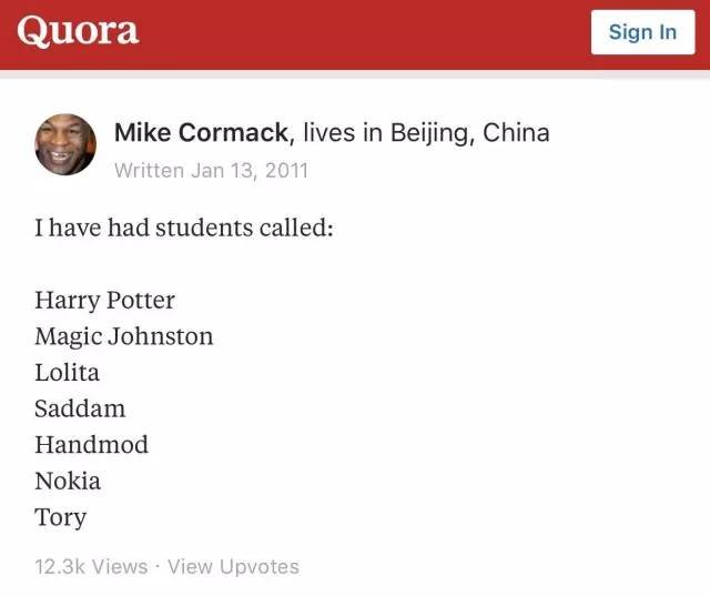 关于中国人的英文名,Quora(类似于国内的知乎)上就有这样一个帖子,非常火爆,获得了超过100个回答: