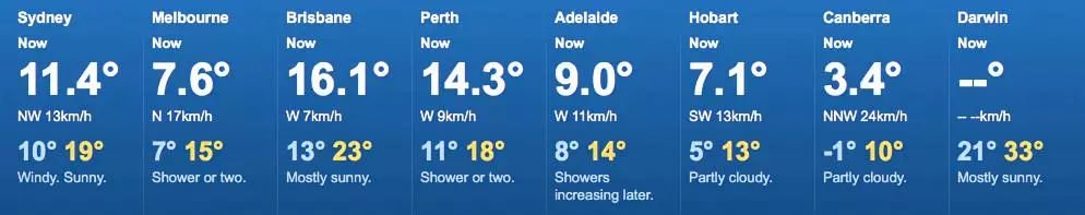 今天白天,悉尼晴,10到19度,墨尔本有雨,7到15度,布里斯班晴,13到23度,堪培拉多云,-1到10度。