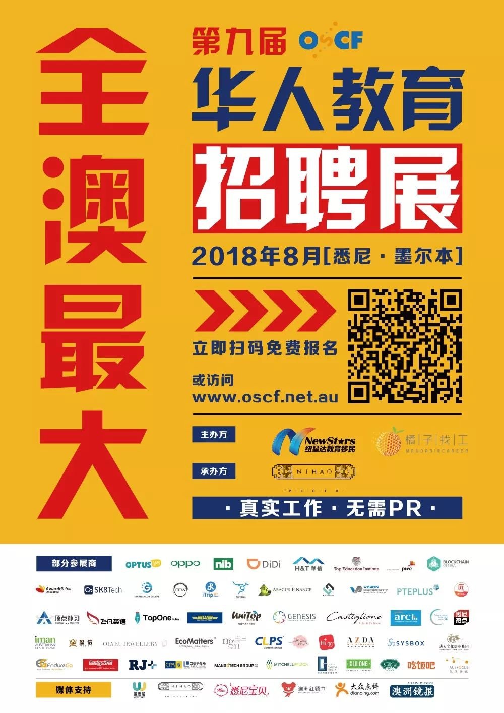 OSCF澳洲中国留学生直聘展,由橘子找工和纽星达教育集团联合主办Nihao MEDIA协办,是澳洲范围内最大的华语招聘展,OSCF旨在成为澳洲地区的留学生和职场精英与企业的求职互通桥梁。