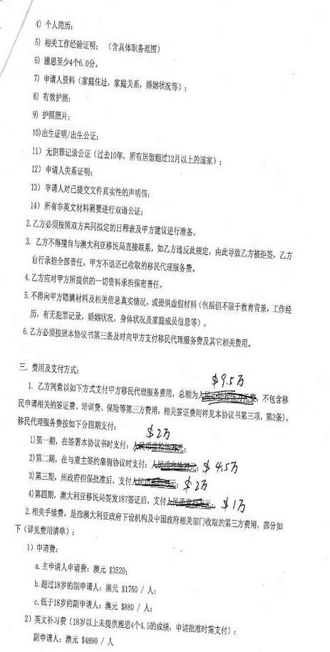 图为187合同,合同表示移民费用一共13万澳元,共分为四个阶段