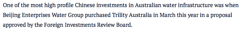 今年三月,在外国投资审查委员会批准的提案中,中国在澳大利亚水务基础设施领域最引人注目的投资之一是,北京企业水务集团,收购了澳大利亚Trility。