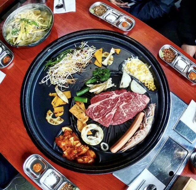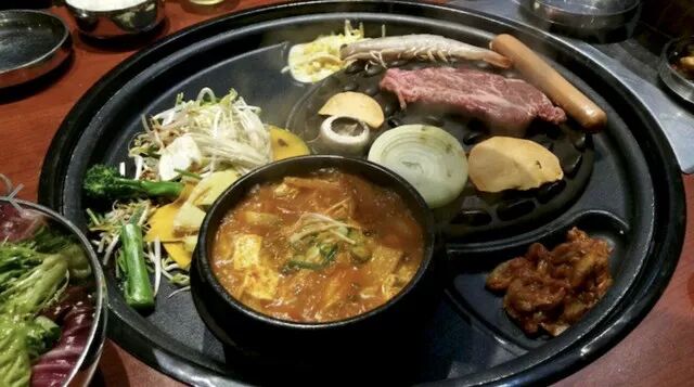 要说这家店的特别之处就是他家的烤肉盘了,不像其他传统的韩式烤肉店仅仅是一个小小的烤肉圆盘或者铜丝网,他家的烤肉盘是一个巨大的黑色底盘中间有着不同的分割。