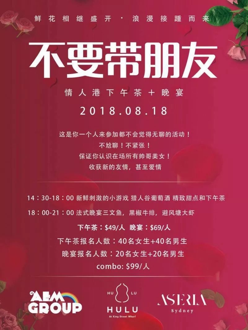 本文来源于网络,不代表“最澳洲”观点。如您认为该资讯侵犯了您的权益,请通过本站侵权投诉页面进行申诉。:最澳洲 » 8月18日千万【不要带朋友】– 因为你要认识79个新朋友!情人港浪漫下午茶+晚宴热情启程~珠宝酒店礼物超期待!